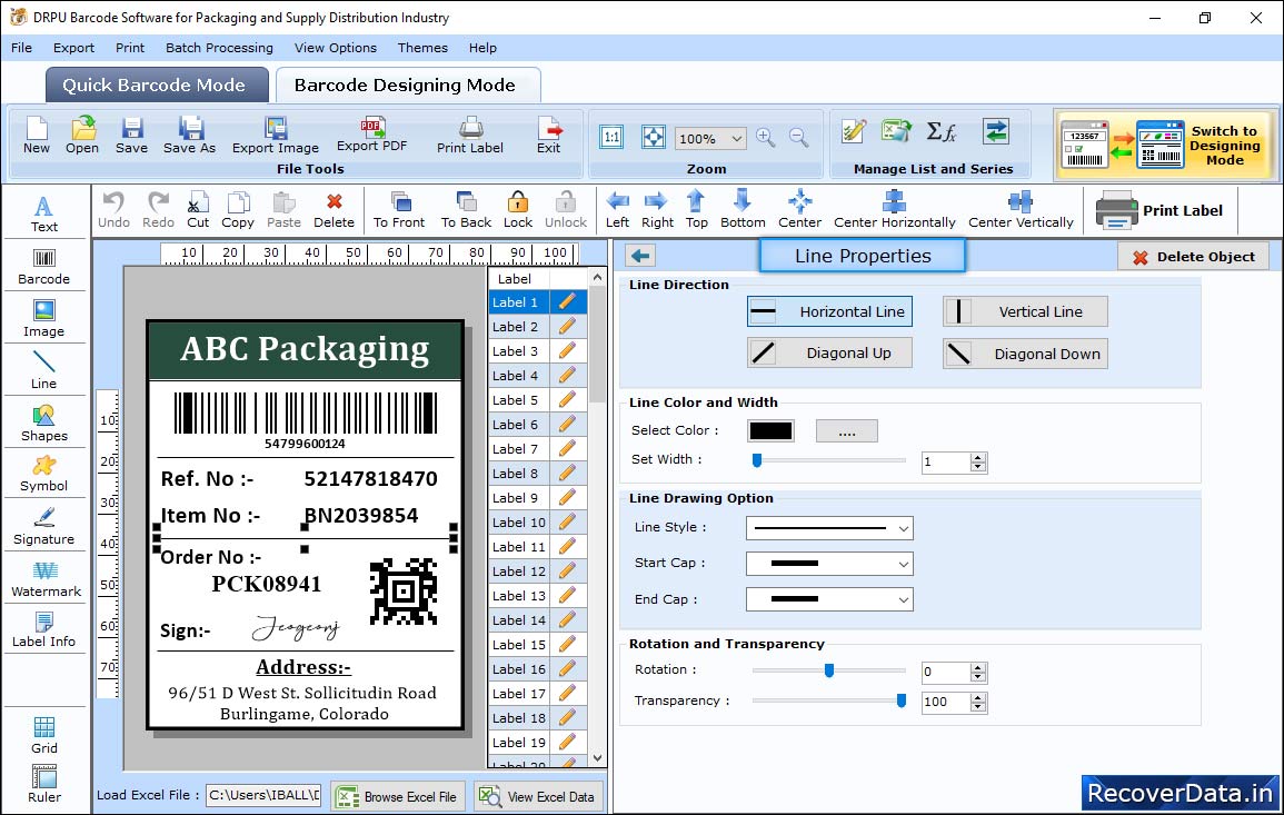 In Barcode Designing View, adjust Shape Outline, Transparency, Rotate to generate desired barcode label using Shape Properties.